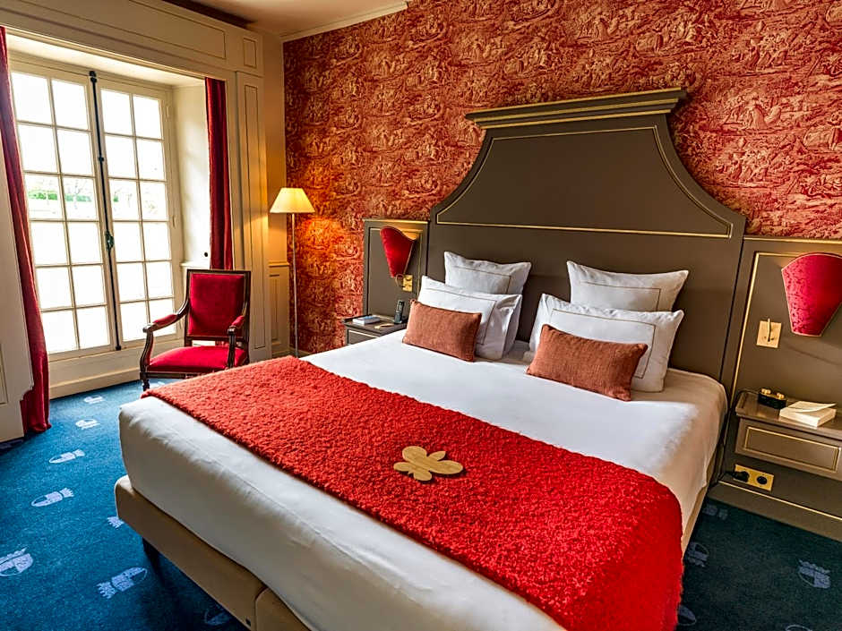This spacious room is located in the former apartments of the chateau and has period furniture. It has a private marble bathroom and a view overlooking the park or main courtyard.